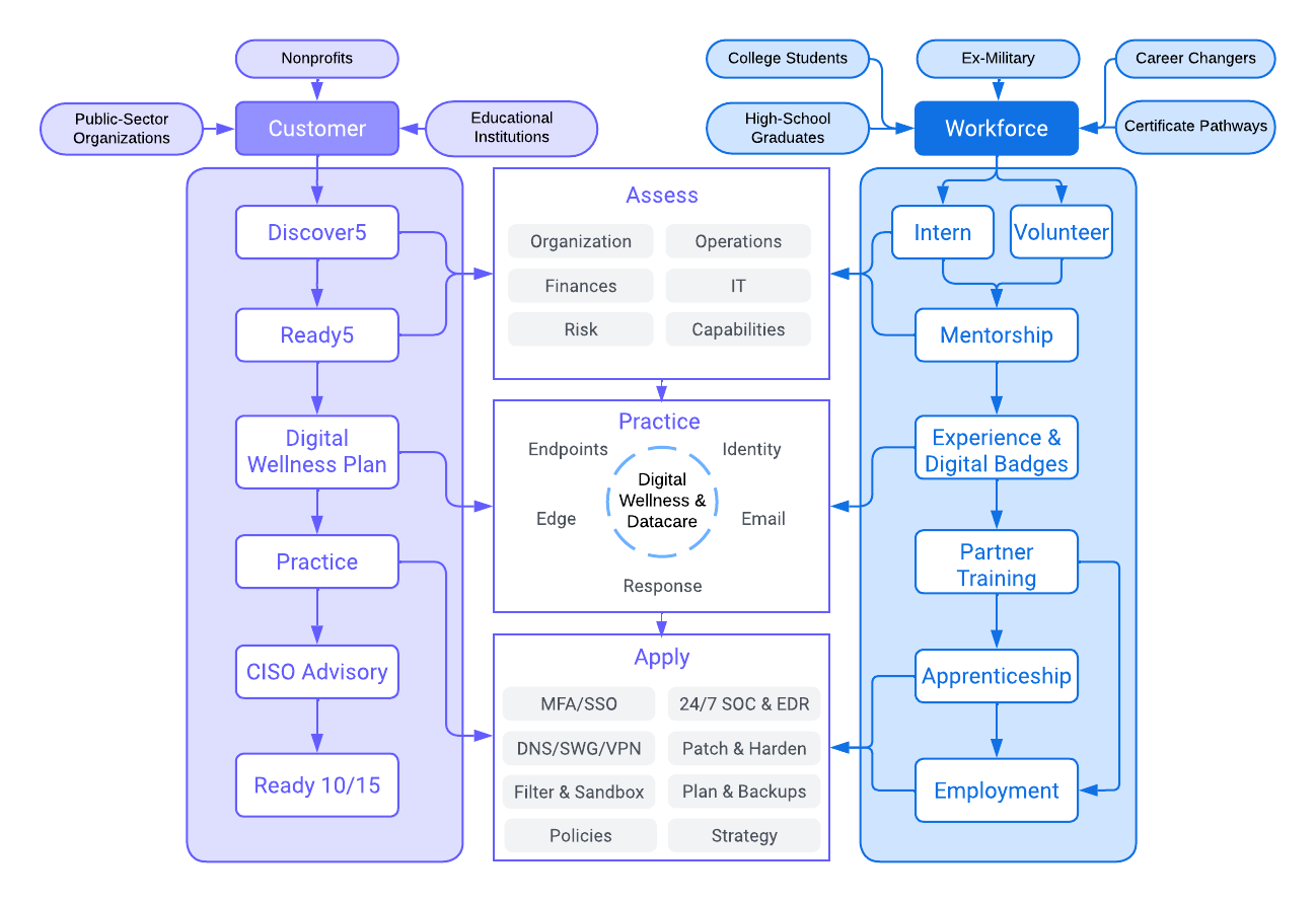 We work with our customers to Assess Cyber Readiness, Practice Digital Wellness, and Apply New Solutions while building the workforce pipeline.